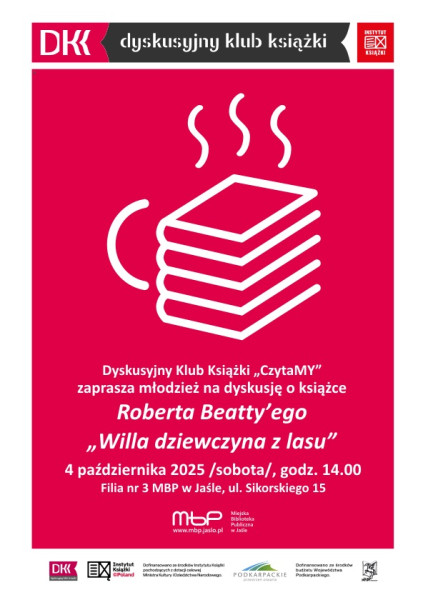 Dyskusyjny Klub Książki „CzytaMY” zaprasza młodzież na spotkanie w dniu 4 października 2025 r. (sobota) o godz. 14.00 w Filii nr 3, ul. Sikorskiego 15. Będziemy dyskutować o książce Roberta Beatty’ego „Willa, dziewczyna z lasu”.