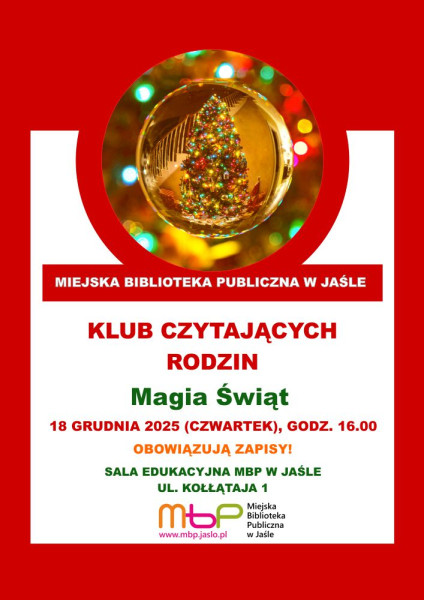 18 grudnia 2025 roku (czwartek) Miejska Biblioteka Publiczna w Jaśle, Oddział dla Dzieci i Młodzieży zaprasza dzieci wraz z rodzicami na wyjątkowe, pełne magii spotkanie Klubu Czytających Rodzin! Będziemy wspólnie czytać przepełnione urokiem, wzruszeniami i humorem świąteczne opowieści, przy których najmłodsi rozwiną wyobraźnię, a dorośli przypomną sobie chwile własnego dzieciństwa. Wybierzemy historie, które mówią o dobroci, pomaganiu i radości z bycia razem. Po czytaniu zaprosimy Was do twórczej zabawy – każdy będzie mógł wykonać własną, wyjątkową bombkę – błyszczącą, kolorową, z brokatem, cekinami, wstążkami… taką, jaka tylko przyjdzie do głowy!