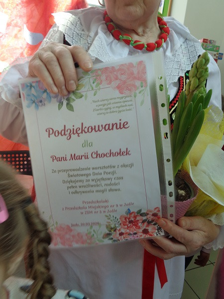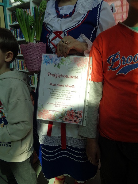 Panie Maria Chochołek i Maria Słowik należą do Klubu Poetów i Twórców Ludowych Ziemi Jasielskiej „Michalina”, działającym przy Miejskiej Bibliotece Publicznej w Jaśle. Od wielu lat piszą wiersze pełne ciepła, nadziei i miłości do małej ojczyzny, ale także do tego, co nas otacza, przyrody i drugiego człowieka. Na zakończenie spotkania poetki otrzymały podziękowania i kwiaty, a dzieci słodkie co nieco.
