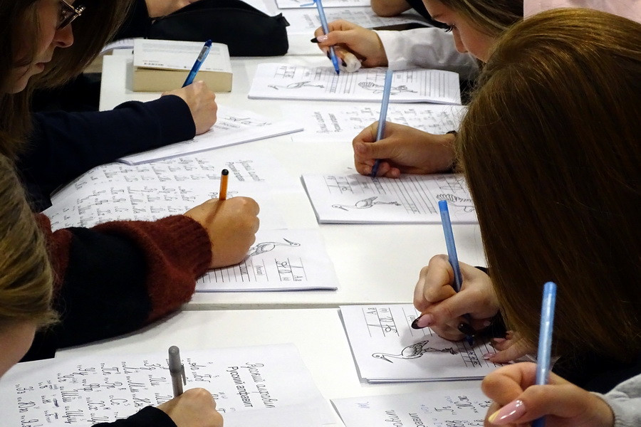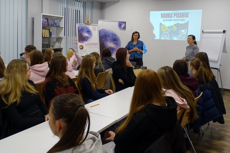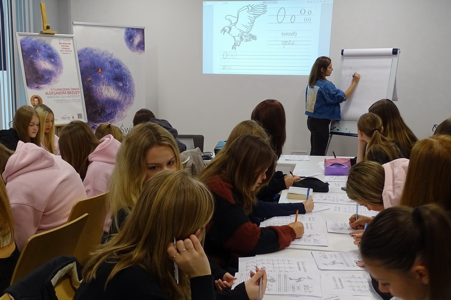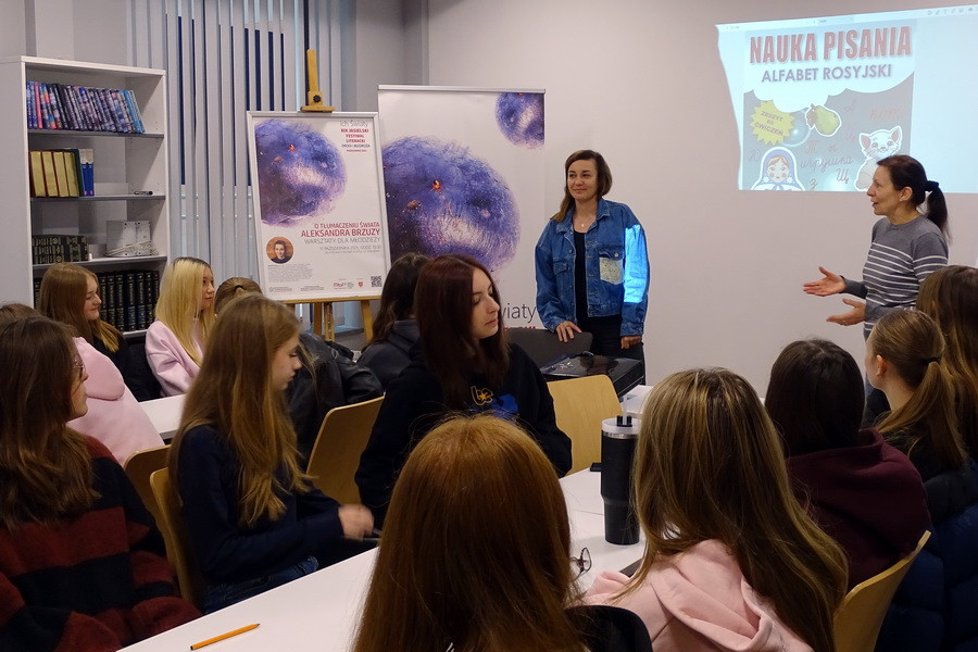 Młodzież poznała podstawy cyrylicy i świat rosyjskiego alfabetu, a każdy mógł spróbować zapisać swoje imię w nowym alfabecie. Ćwiczenie okazało się nie tylko nauką, ale też świetną zabawą. Warsztaty przebiegły w atmosferze ciekawości i otwartości na poznawanie nowych języków i kultur, a młodzi licealiści z pewnością wynieśli z nich inspirację do dalszego zgłębiania tajników nowo poznanego języka i sztuki tłumaczenia.