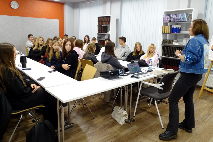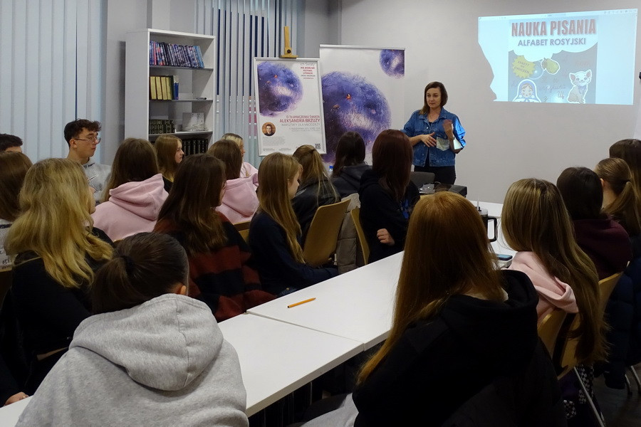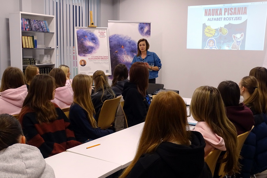 Prowadząca zaprosiła młodzież do rozmowy o tym, jak wyobrażają sobie zawód tłumacza. Dyskutowano o różnych rodzajach tłumaczeń oraz o tym, jakie studia i umiejętności są potrzebne, by pracować w tym zawodzie. Opowiedziała o krajach, w których używa się języka rosyjskiego, zwracając uwagę na to, jak kultura i kontekst społeczny wpływają na sposób tłumaczenia tekstu. Uczestnicy mogli przekonać się, że tłumaczenie to nie tylko przenoszenie słów z jednego języka na drugi, ale także umiejętność oddania ducha i realiów danej kultury.